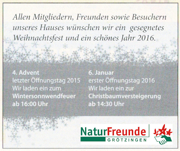 Wie immer am Freitag vor dem 1. Advent stellen wir am 28.11. ab 19 Uhr im Naturfreundehaus verschiedene Weihnachtsdeko her. Material ist - auch für Gäste - ausreichend vorhanden, es können aber gerne auch mitgebrachte Sachen verarbeitet werden. In diesem Jahr gibt es Vorlagen mit Korkenzieherweide. Wer für sich selbst keine Deko machen möchte, kann vielleicht bei der Deko fürs Naturfreundehaus mithelfen und am Ende einen Bratapfel genießen.